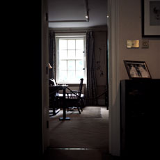 When Matt showed me his photographs of 95 Marsfield Gardens I was struck my their brightness as my own memory of visiting this place was dark and repressive. I asked Matt where the first image in the series was shot he said, "Somewhere between Marx's tomb [in Highgate] and the Freud residence". Matt's sequence is intriguing: from the bottom of the stairway up to the top of the landing and beyond to the window in the room with the dark furniture -- redolent wood/ effulgent light (Heliotrope III). Downstairs, circular light in door, upstairs rectangular light in a dark room (Heliotrope IX, VII, VIII). There is no approach, neither forward or backward: the image is just fixed there, in the dark, looking at the light - the house's internal structure. - Gus B. |